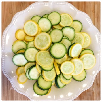 I bought zucchini and summer squash from Aldi last week and hadn’t gotten around to using it yet, except for one of the zucchini that I used to make a chili boat over the weekend (I cut in half a zucchini, scooped out the seeds and baked it, then filled it with leftover chili and baked some more). So I started the rice in a pot on the stove, put the shrimp in a bowl of warm water in the sink to thaw, then sliced up one of the zucchini, two of the summer squash and three green onions (I always have to have these in the fridge because my boys love them), and scooped a couple of teaspoons of minced onion from the jar I keep in the fridge. Seriously…I use garlic in everything!