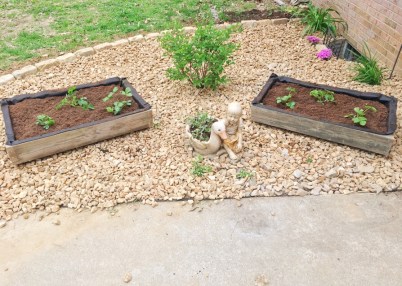 I love how these turned out! They look great in my new rock bed, they’re in the part of my yard that gets all of the sun, and it will be easy to control their spread and keep their blooms pinched off for this growing season because they’re confined to these boxes.