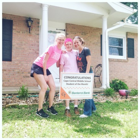 I called to Hunter that whoever it is, they can’t stay because we’re leaving, assuming it was a neighborhood kid. Hunter looked out the window and said, “it’s not for me, there’s a bunch of grown ups out there.” Shit! I’d completely forgotten that the middle school teachers drive around to the houses of each student of the month to put signs in their front yards and take pictures with them. I yelled at Logan to get his butt out of the bathroom as I rushed to the front door. I pushed Ruby back from the door, opened it just enough to squeeze through, then pulled it shut behind me before she could spill out onto the porch in a furry, frenzied, yapping heap.