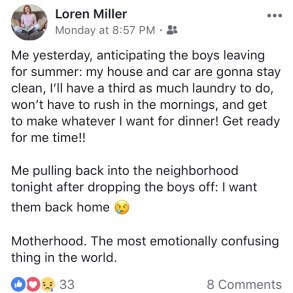 I took a shower, then Hunter called and I talked to him and Logan until it was time for me to go to bed. My emotions seemed to finally understand that the boys were gone, and that empty feeling gave way to acceptance. I slept well that night, and I woke the next morning ready for whatever the summer might bring my way.