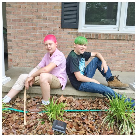 Logan finally made his way outside, his pink polo shirt and neon pink hair brightly reflecting the sun, to get his picture taken with his teachers standing around the sign they’d placed in our yard. Mrs. Doran said she had to wear her pink shirt just for him, causing a blush that nearly matched his hair. My boys have been talking all year about dying their hair funky colors. So for the last day of school I bought colored hair spray and let Hunter color his hair bright green, and Logan neon pink. How cool is it that they go to a school where their individuality and self-expression is celebrated by the staff?!