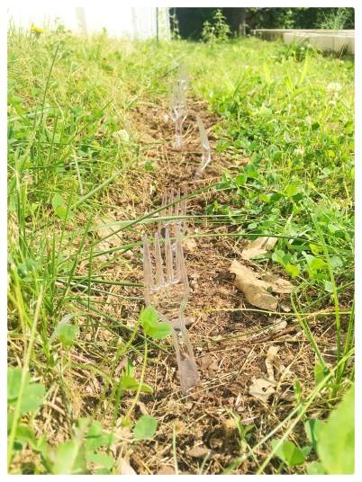 Plastic forks left over from Logan’s birthday party! I found the idea on Pinterest and really hope it works! I’m also going to pick up some Cayenne Pepper when I get groceries tomorrow, and I’ll sprinkle that on the ground around the forks as well, just as an added layer of protection.