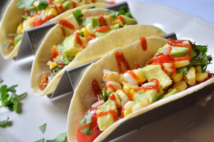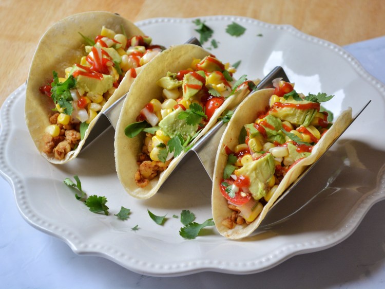 - Once tortillas are done, it’s time to assemble. Place tortillas in a taco holder or on a plate. Scoop a generous tablespoon of tempeh onto the tortilla. Layer on some arugula, as much or as little as you like. Scoop on a generous tablespoon of corn salsa. Top with diced avocado and a drizzle of sriracha. If you’re not a fan of heat, you can alternately use salsa