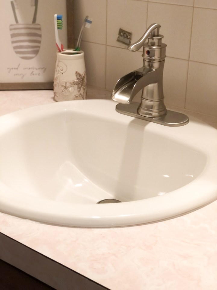 The other big event of the week – I finally replaced the sink and faucet in my bathroom! My house was built in 1967, and the half bath that is in my bedroom still had the original cast iron sink, which was rusting around the drain, and the original faucet. I couldn’t even get warm water out of it – if I turned on the hot and the cold, it would alternate between the two rather than blending them for warm. You would get a second of scalding hot water, followed by a brief stream of icy cold. As a result I only use my bathroom sink for brushing my teeth and do everything else in the main bath.