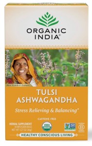 My favorites of these are ashwagandha, tulsi, and turmeric. I found ashwagandha in powdered form, like I used in the matcha recipe below, and I find it simple to use this way. It can also easily be blended into smoothies. I also really like this Organic India Tulsi Ashwagandha tea (linked to Amazon):